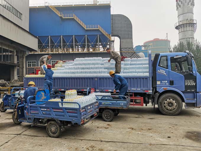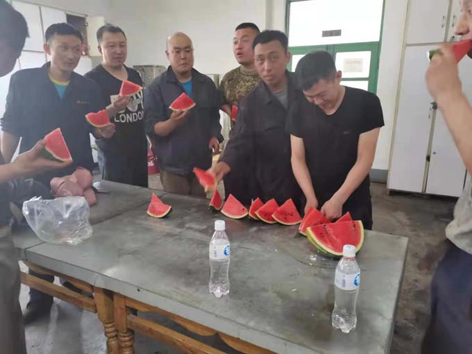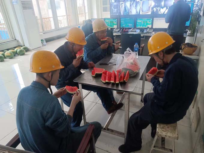 廠房里,公司工會(huì)為奮戰(zhàn)在一線的職工發(fā)放清涼解署的鹽汽氣和西瓜,給大家送去一份夏日的清涼。工會(huì)主席叮囑職工要注意生產(chǎn)安全,合理安排作息時(shí)間,做好防暑降溫工作。